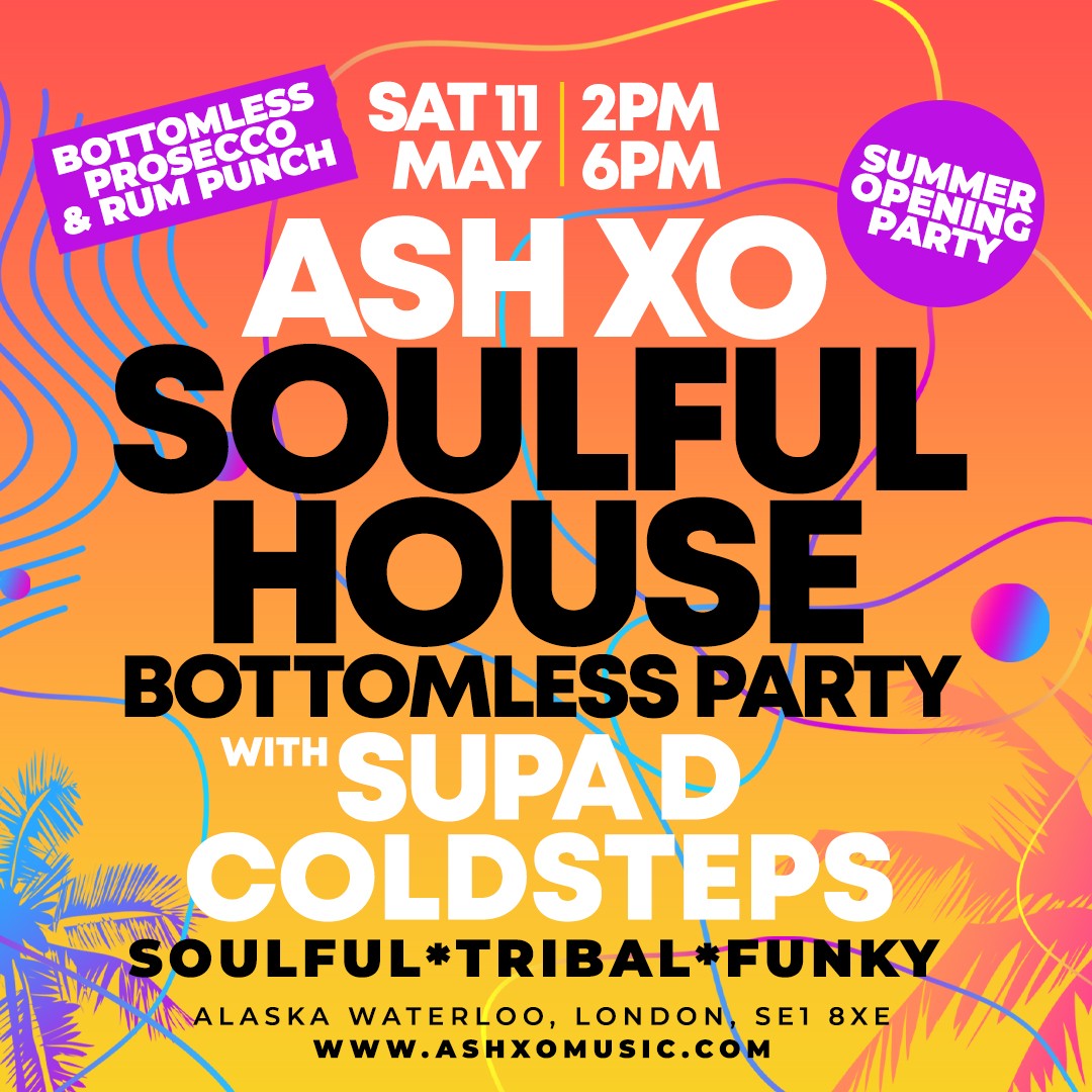 Get ready for sweet vibes at the summer opening party of ASH XO Soulful House Bottomless Party on Saturday 11th May at Alaska Waterloo, headlined by the formidable Supa D & Coldsteps.
