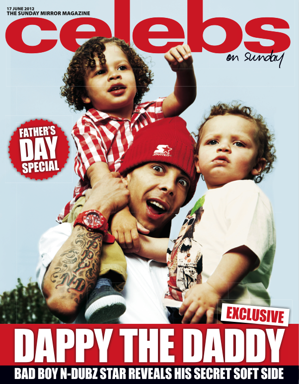 Bad boy Dappy celebrates Fathers’ Day by being photographed with his two children Gino and Milo for the very first time for the Sunday Mirror’s ‘Celebs on Sunday’ magazine. In the special ‘Fathers’ Day’ issue of the magazine out this Sunday, Dappy shows his more responsible and tender side.