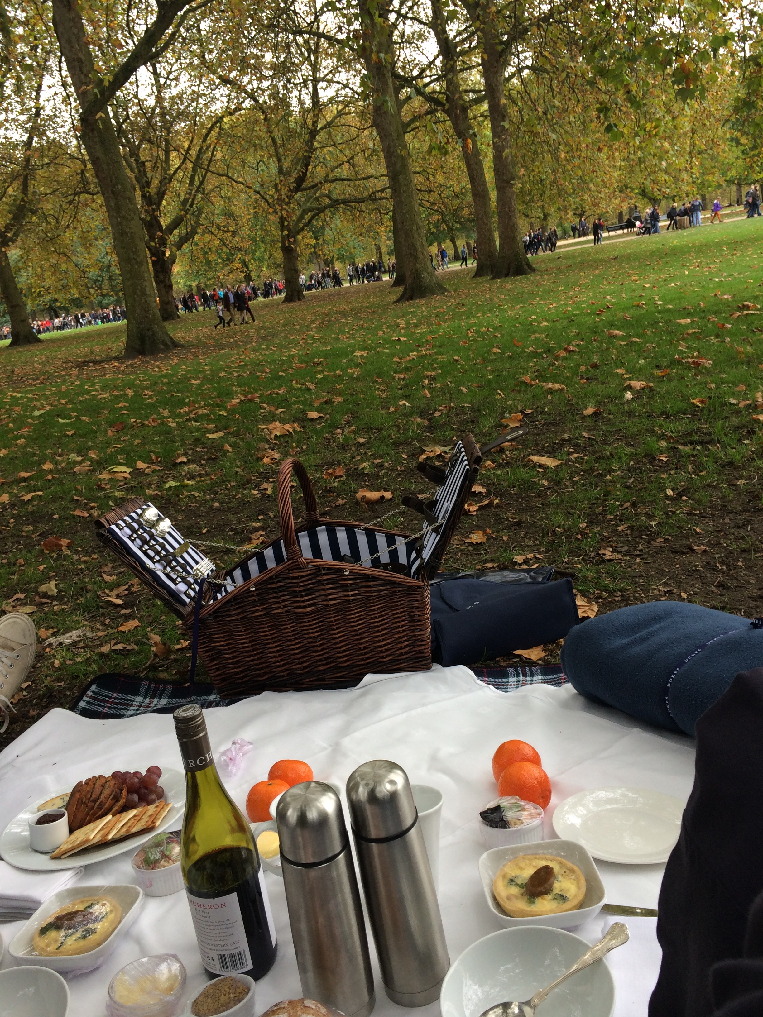 Continuing the feast we enjoyed a seasonal broccoli, chestnut and onion tart and delicious pheasant rilletes with quince jelly and rye bread. The food did not end there – we were also provided with flasks of rich hot chocolate and large marshmallows, satsumas and stilton cheese and biscuits. With so much food the butler helpfully suggested we take at least an hour and a half to take our time and slowly enjoy all of the amazing food presented before us. It was an amazing experience to spend 90 minutes watching the world go by in the park sipping red wine and being under no time restraint; our butler was ready to return and clean up at our disposal.