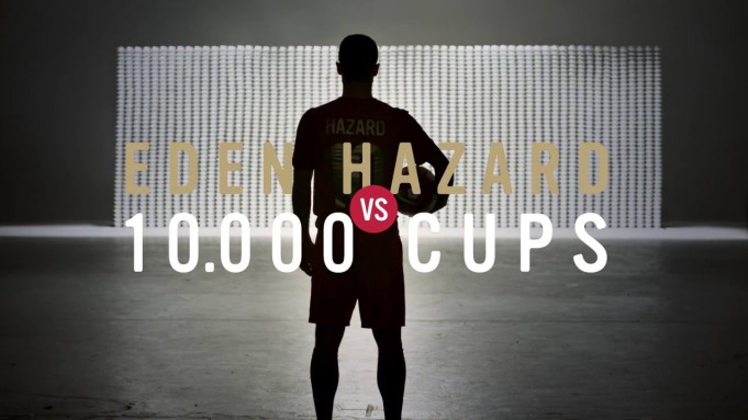 10,000 cups? Yep, 10,000 cups. The challenge for Eden Hazard: Kick a ball through a wall of 10,000 cups, hits the target, so that the Lotus biscoff drops into the tea cup.