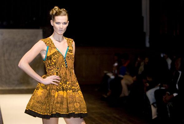 Untold founder Maame Baryeh set the bar for menswear with ‘MaLE’ – a playful collection featuring sports luxe trousers, imaginative shapes and oversized buttons. However, Fashion Diversity 2009 winner Desiderata may be hot on her heels, as he set a tone of ‘sexy castaway’ with his collection of rope tied harems and androgynous skirts for men. Dramatic underwear came from Pia Love – stunning bras embellished with everything from lace to feathers, gave the models a sexy native American vibe.