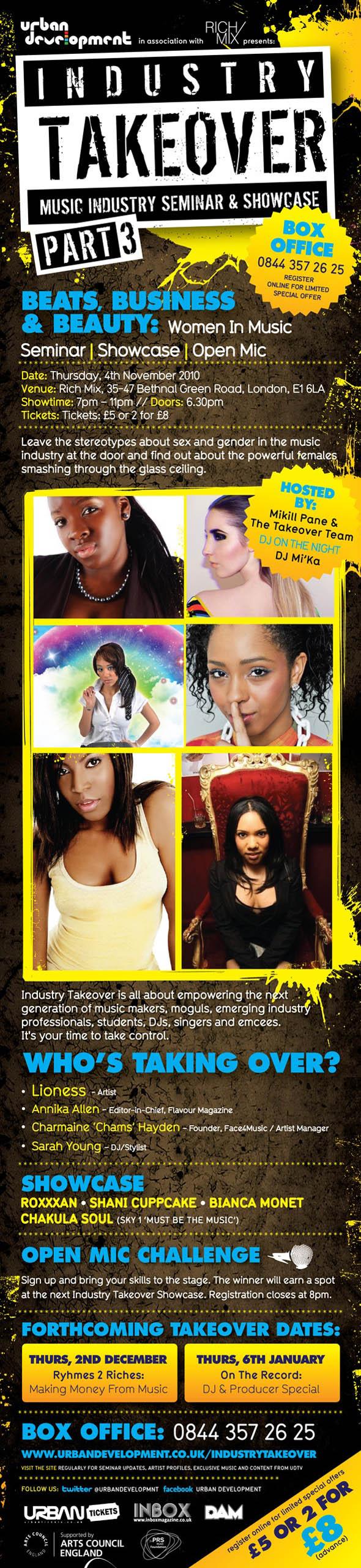 Urban Development in association with the Rich Mix bring you a top line up of the … ladies in UK entertainment for the second leg of Industry Takeover Music Industry Seminar & Showcase this November 4th at the Rich Mix.