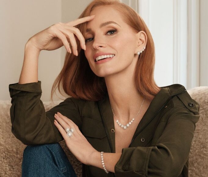 From the Belle Époque Reel to the Margherita collection, Chastain’s fiery locks and flawless features perfectly complement each exquisite creation. Under the expert styling of Elizabeth Stewart, Chastain dons contemporary masterpieces, including striking stacked bracelets and rings that make a bold statement.