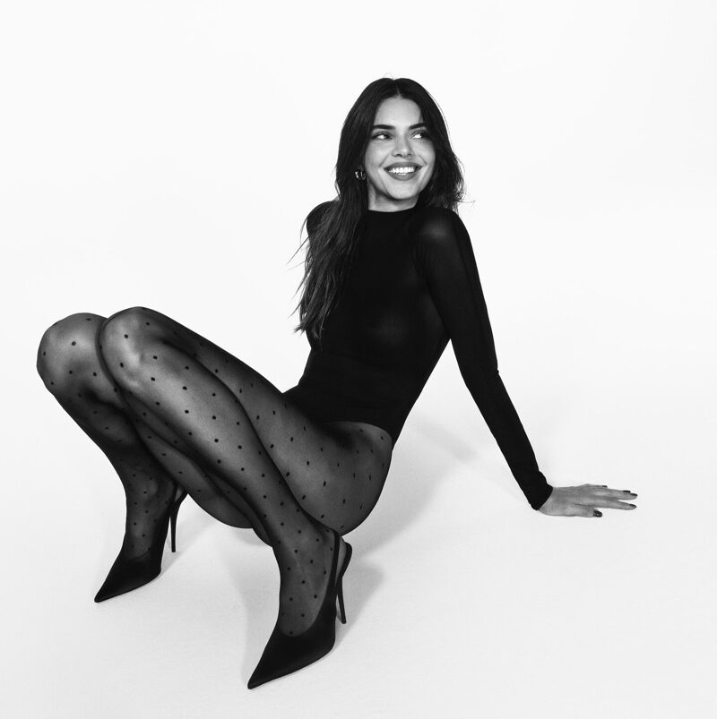 Captured through the lens of photographer Yulia Gorbachenko, Jenner stands out in a minimalist studio setting, effortlessly pairing the brand’s statement stockings with sleek bodysuits and cosy knits. Her look radiates confidence and sophistication, showing off her long, elegant silhouette.