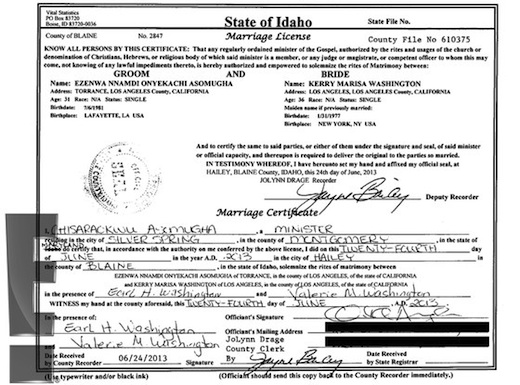 In case you’re still in doubt about this surprise scandal, E! News have released Washington and Asomugha’s marriage certificate. Kerry currently stars in Scandal as Oliver Pope, and she recently appeared in Quentin Tarantino’s Django Unchained. Her other roles include background characters in For Coloured Girls, Little Man and Fantastic Four.
