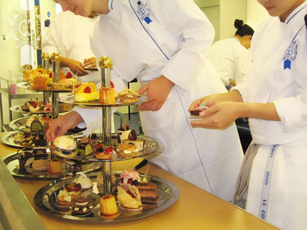 Dolloping gargantuan amounts of clotted cream onto an airy apple and cinnamon scone I took in the full bounty before me. Every intricate detail is flawless, the perfectly piped butter cream crowning the macaroons or the pear silhouettes stencilled in cocoa on the poiriers demonstrate the artistry of this craft. Not only a feast for the stomach but also for the eyes, combining a plethora of delicious flavours with exquisite presentation. These creations really are edible sculptures. It’s no wonder that along with amazing new skills in cuisine the average female student also gains a stone in weight over the duration of the course. One can only assume the male members aren’t admitting to it!