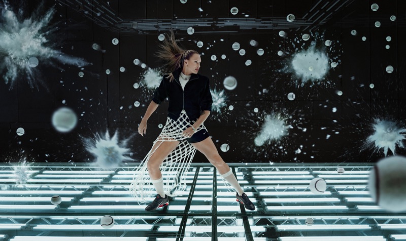 Styled with mesh layering, digital grid patterns, and that unmistakable post-sport glow, the visuals drip with dystopian drama. Aryna’s presence is commanding—grounded, fierce, and fully in motion. Whether she’s crouched in a neon-lit cube or striding through the night in billowing pleats, the message is clear: the Shox Z is for those who move with impact.