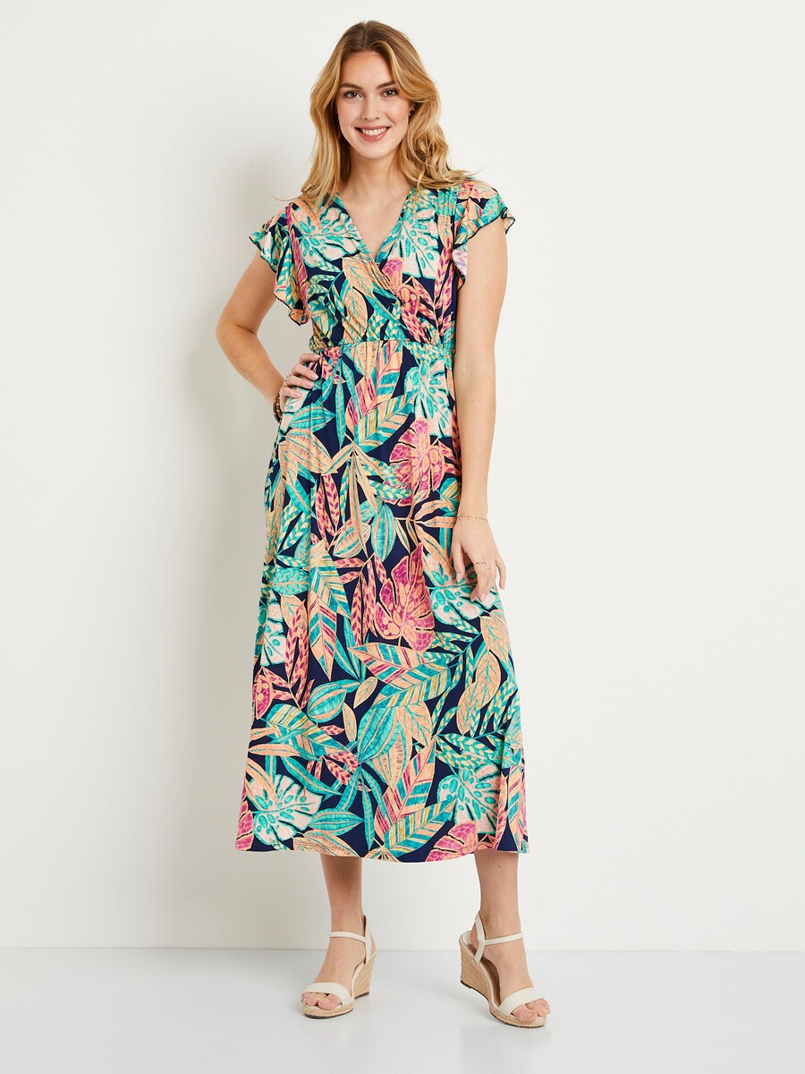 A long dress lengthens your figure, especially if you are short and rounded. On the other hand, frills take attention away from your curvy bottom while providing more room for added comfort. The short kimono sleeves enhance the seductive casual style and show off some skin.