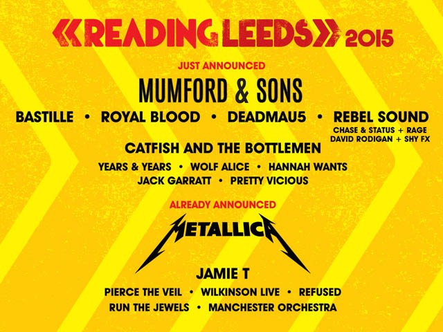 Reading & Leeds Festivals reveal MUMFORD & SONS as Main Stage headliners! ROYAL BLOOD, BASTILLE, DEADMAU5, REBEL SOUND FEAT. CHASE & STATUS, RAGE, DAVID RODIGAN AND SHY FX, CATFISH AND THE BOTTLEMEN, YEARS & YEARS, WOLF ALICE, PRETTY VICIOUS, JACK GARRATT AND HANNAH WANTS also announced to appear across the weekend!