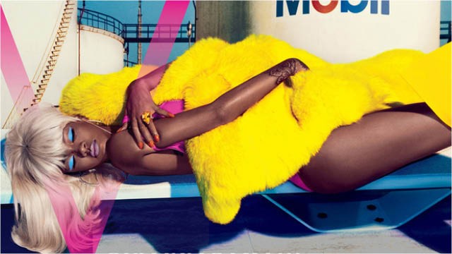 This time Rihanna is solo, rocking bikini looks and blonde hair with exuberant colour summer make up. The poses are seductive and in the cover shoot Rihanna is topless wearing only a bikini bottoms.