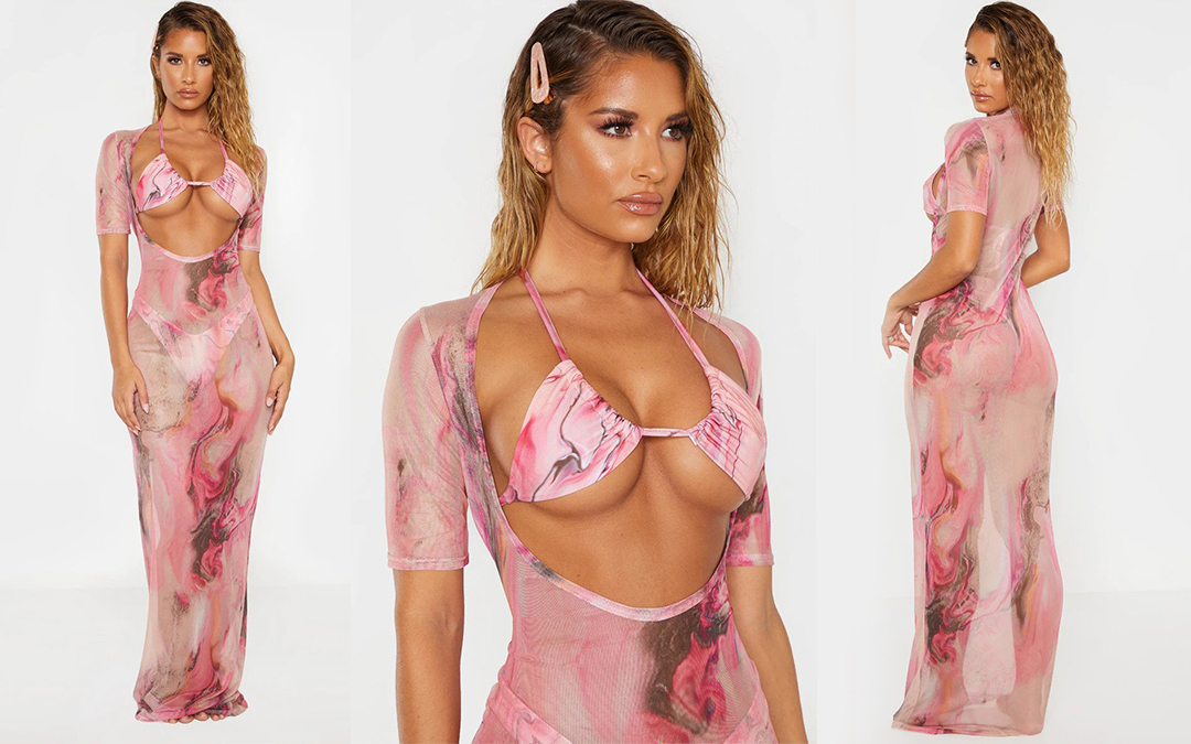 Now, this is a dress that will not only stop traffic but also likely to cause a pileup during lockdown. The Pink acid print short sleeve scoop mesh Maxi Dress from PrettyLittleThing worn by model Sierra Skye is more than a simple head turner.
