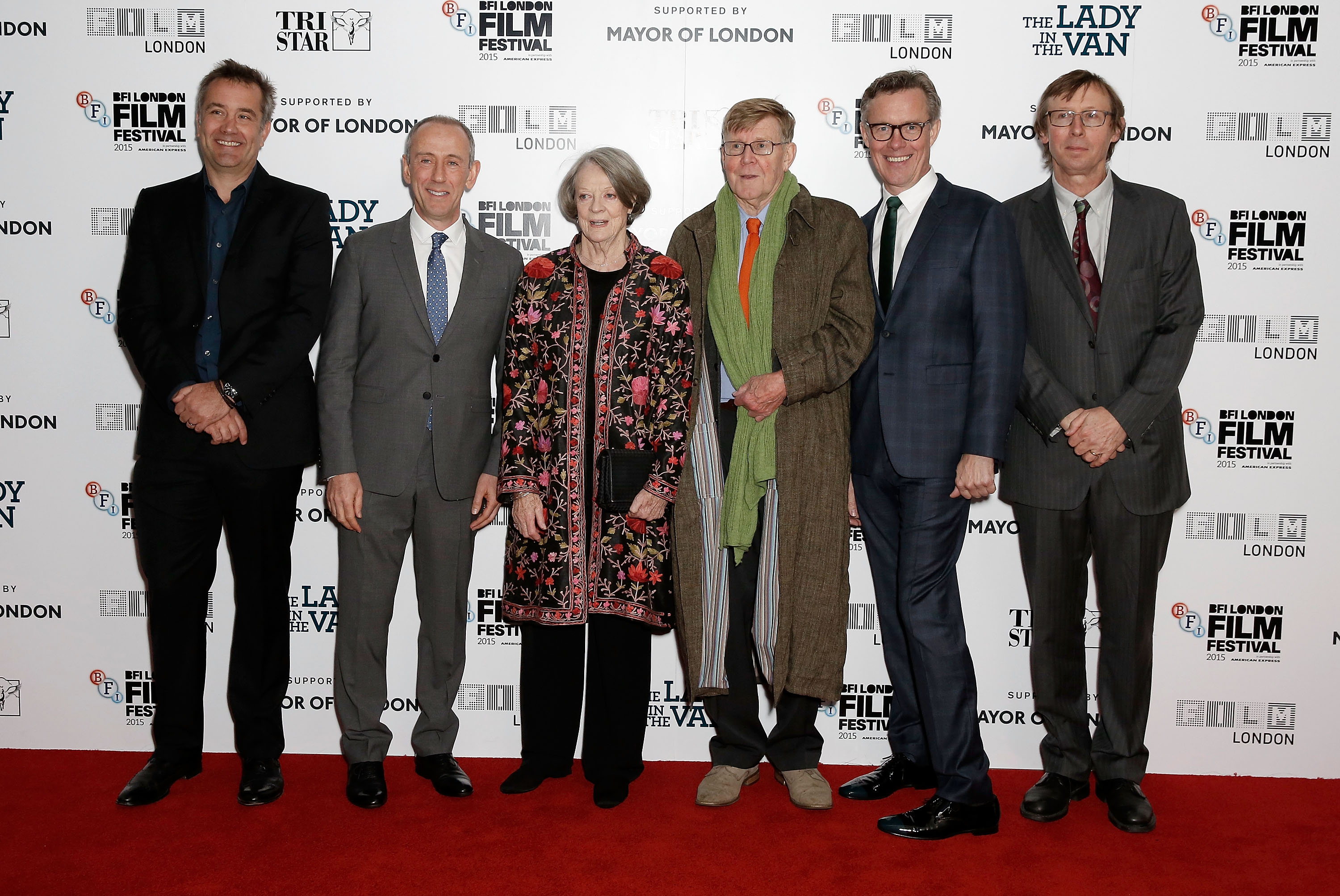 LONDON, ENGLAND - OCTOBER 13: Damian Jones, Nicholas Hytner, Maggie Smith, Alan Bennett, Alex Jennings and Kevin Loader at Odeon Leicester Square for "The Lady In The Van" - Centrepiece Gala, on October 13, 2015 in London, England. (Photo by John Phillips/Getty Images for BFI) *** Local Caption *** Damian Jones; Nicholas Hytner; Maggie Smith; Alan Bennett; Alex Jennings; Kevin Loader