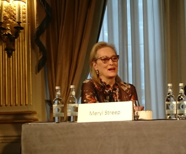 “What I thought was interesting about the screenplay was that it fell to a woman to hold the line for press freedom at a time when women were excluded from any kind of leadership role in the press. There were no women reporters; it was very unusual. Our Friend Nora Ephron (who this film is dedicated), graduated from Wellesley, ran the paper there, went to Newsweek to interview to be a reporter.At that time Katherine Graham owned Newsweek, and the interviewer told her she was very welcome, she was a brilliant woman. She was very welcome to be a researcher, a copy girl or a secretary but reporters were men. I look round this room, and I see many many women, and you would not be here in 1971, so it was a different world. So for this crucial, decision to hold the line, and to risk everything, to have that fall to a woman, who was all alone in her position, that’s what interested me. Both, holding the line for press freedom and the fact that it was a transitional moment for women.”
