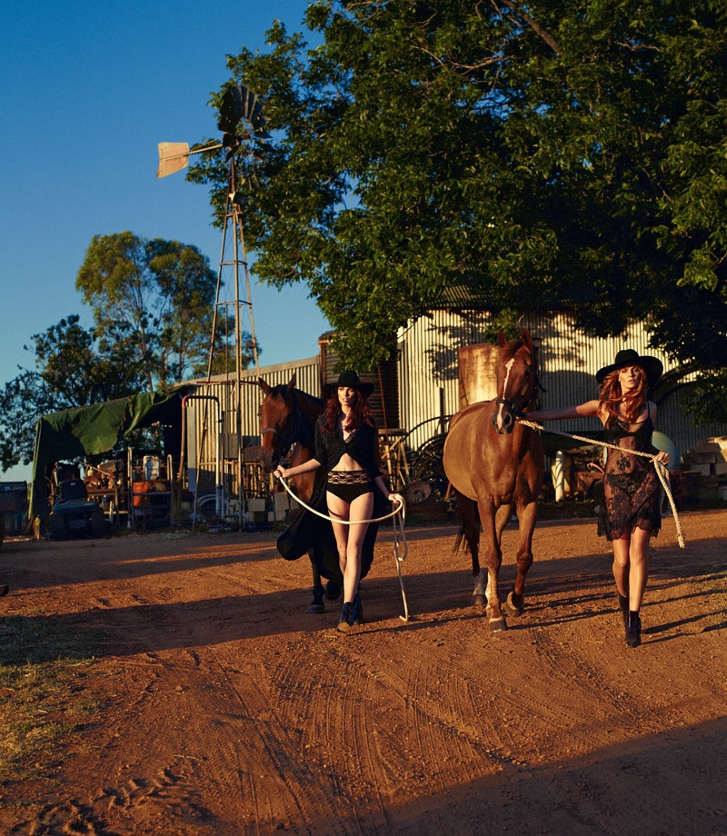 Channeling their inner cowgirls, the models go head to the great outdoors for a western inspired editorial. The redhead and brunette pose for Cheyne Tillier-Daly in bold and sexy ensembles styled by Teagan Sewell.