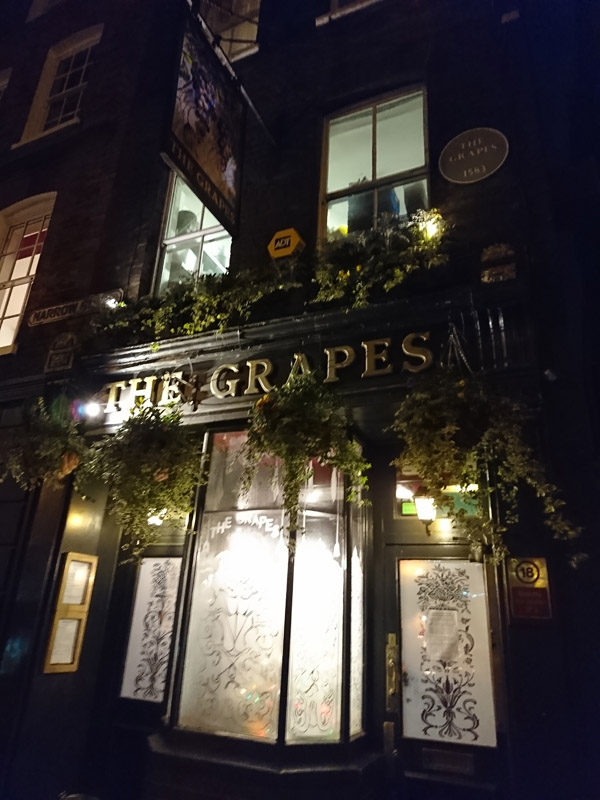 As the sun had disappeared from the wintery skies, we headed towards our final location, a small and narrow pub by the name of The Grapes, a watering hole owned by British actor, Sir Ian McKellen, and serves one of the best wines this writer has ever had the privilege of guzzling. The pub alone has a history which dates back over 500 years. It is said that Sir Walter Raleigh set sail on his third voyage to the New World directly beneath the building. Its history also includes appearing in the writings of Samuel Pepys in 1661. The pub is also associated with Charles Dickens, who is said to have described the pub in his novel “Our Mutual Friend.”