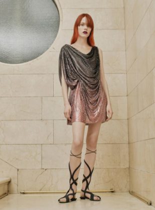 Looks range from sculptural with dramatic pleating and feathers to high hemlines adorned with fringe and lace cords.