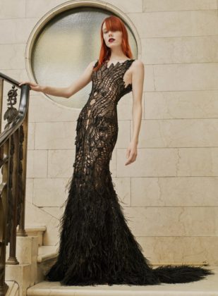 The new season of Atelier Versace spring 2017 collection features uber-glamorous looks with a triple dose of sex appeal. Focusing on a theme of metamorphosis, designer Donatella Versace created gowns and minidresses in cascading silhouettes. Looks range from sculptural with dramatic pleating and feathers to high hemlines adorned with fringe and lace cords.