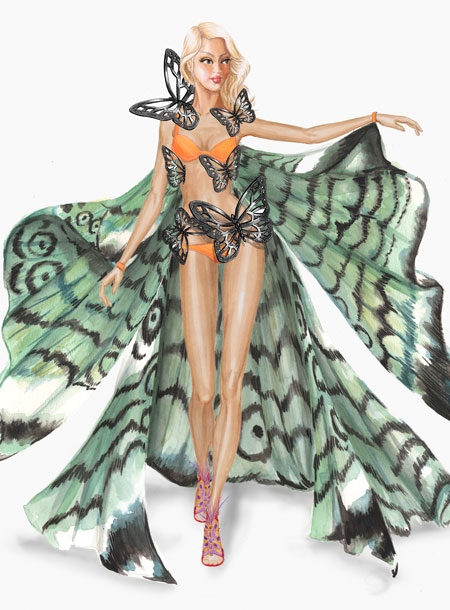 EXOTIC BUTTERFLIES: Kaleidoscopic colors and textures in this section echo the intricacy of a butterfly’s wings. Angels are transformed into these most exquisite, multicolored winged creatures as they walk down the runway. Click on the gallery pic to enlarge.