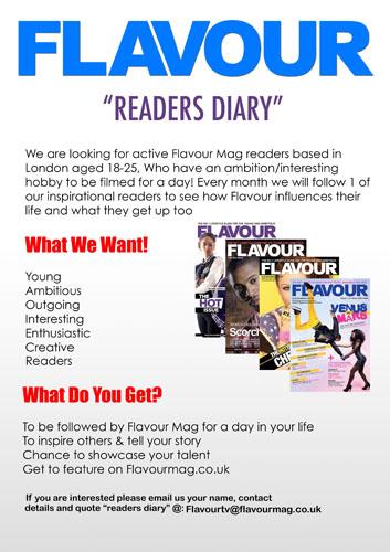 We are giving you the chance to be on Flavourmag.co.uk in your own personal video documentary about YOU! This is part of Flavours new monthly video upload called “Readers Diary”. Competition for this will be hot so send in your application now!