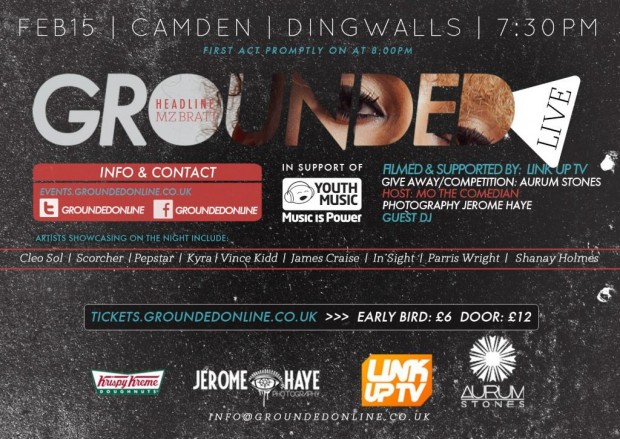With an incredible line up, and with this being Grounded Live’s 1st event ever, it’s definitely NOT one to be missed! Headlining this event is none other than Mz Bratt along with Cleo Sol, Scorcher, Pepstar, Kyra, Vince Kidd, James Craise, In’sight, Parris Wright and Shanay Holmes; what an ecleptic line up.