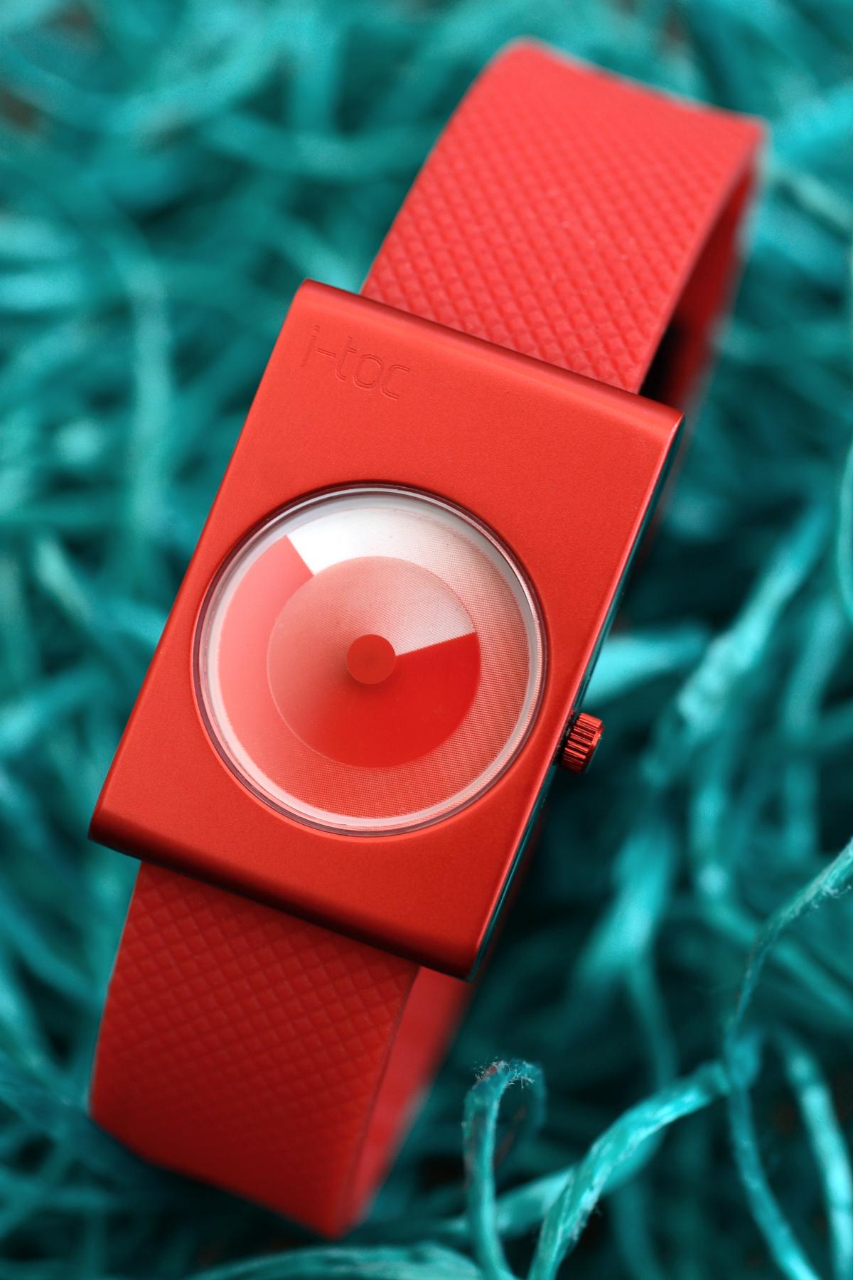 The i-toc watch adds two further elements beyond that of the unique clockface namely asymmetry and colour. The clockface is located off-centre in a rectangular case. The watch is available in six vibrant colours. This is a watch for people that want to express their individual personality, for people who don’t want to be part of the norm.